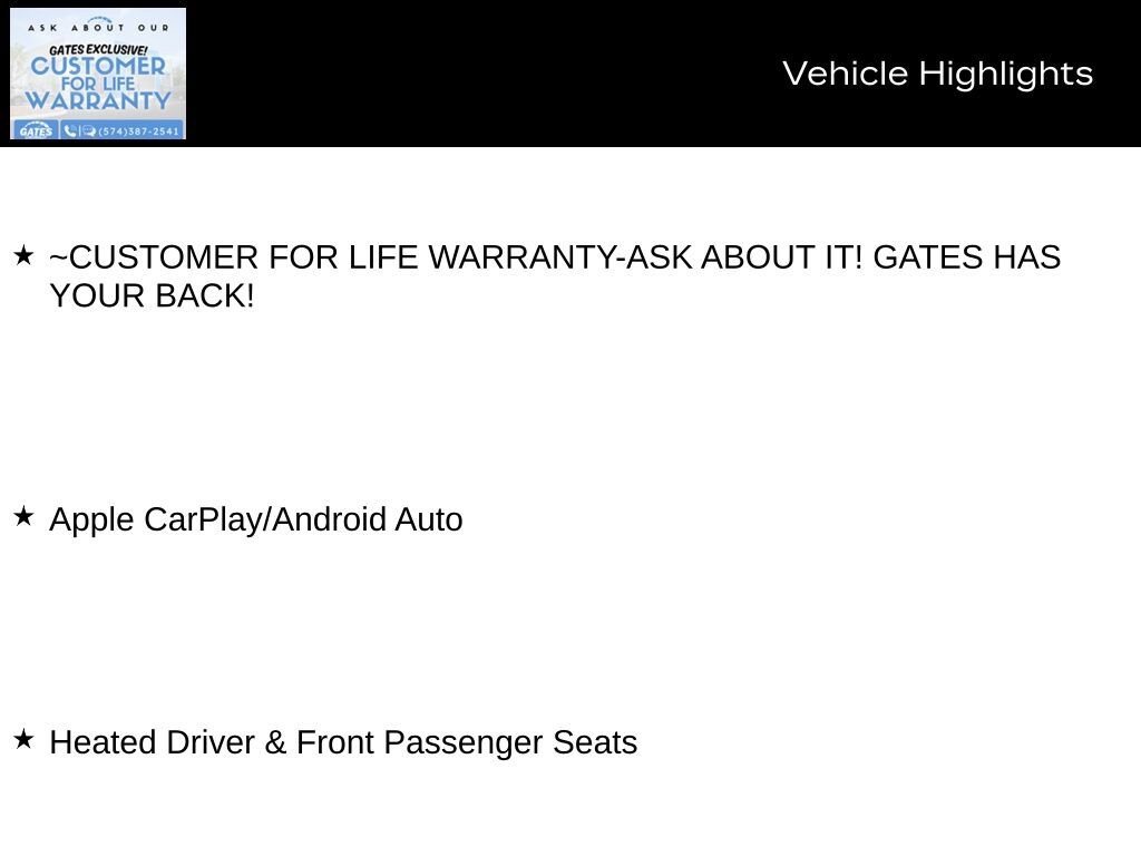 All pricing and details are believed to be accurate, but we do not warrant or guarantee such accuracy. The prices shown above, may vary from region to region, as will incentives, and are subject to change. Vehicle information is based off standard equipment and may vary from vehicle to vehicle. Call or email for complete vehicle specific information. Pricing does not include taxes, title, dealer doc fee of $235 and $15 state convenience filing fee. Some digital classified marketing data may be unauthorized by Gates Automotive. Third party classified digital marketers, and/or associated websites, may advertise unreliable or outdated pricing data.